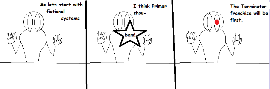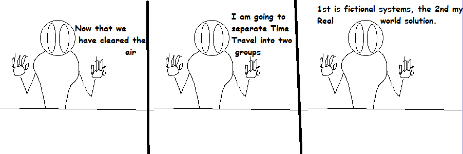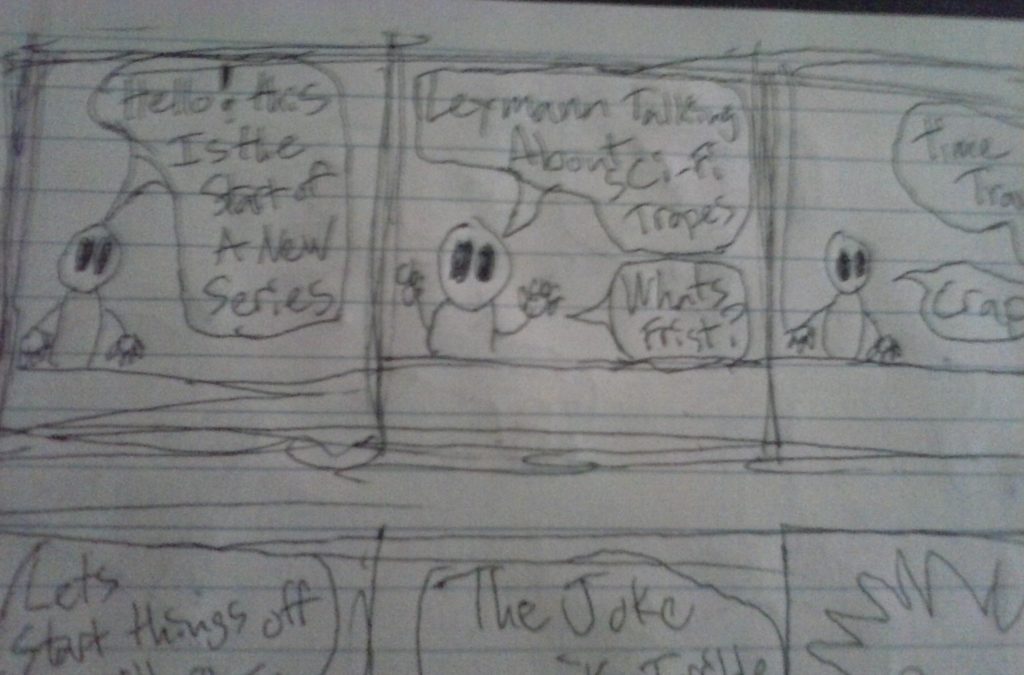 Panel 01 Host: “Hello! this is the start of a new series.” Panel 02 Host ” Layman Explaining Sci-Fi Tropes” Host “So What’s First?” Panel 03 Author “Time Travel” Host [dejected] “Crap”